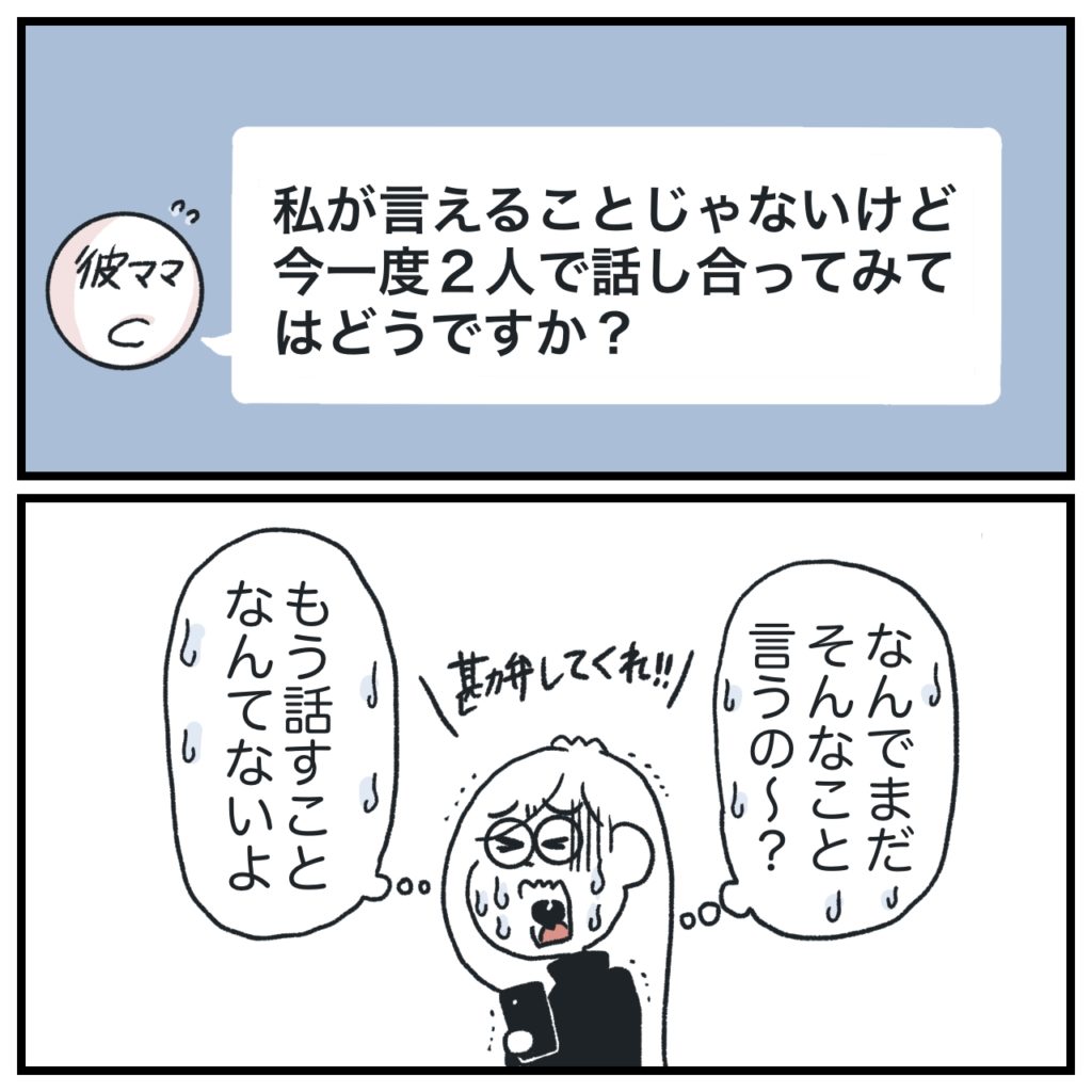 ご両親双方への報連相は継続です。昨晩彼から電話が来て、私が一方的に切った旨も共有しました。