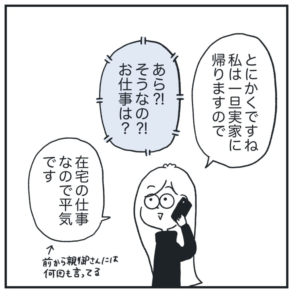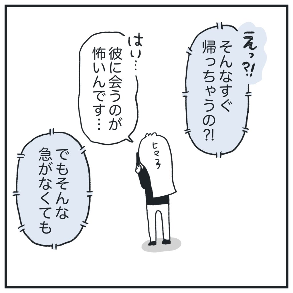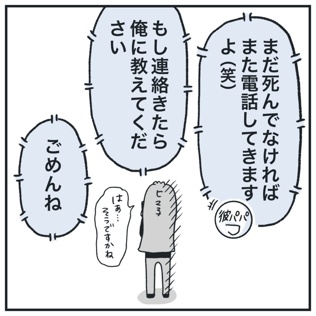 遠慮しながらだけど、ここまで彼パパには繰り返し「彼のことが怖くて仕方がない」と伝えていたのに、私が彼の話を聞ける状態かどうかはお構いなしで悲しかったです。まぁ彼の親御さんだし息子のこと心配だよねそりゃ。私も私で彼が「死ぬ」とか言ってたことが引っかかってるから「はあ、そうですかね」みたいな曖昧な返事しちゃいました。
