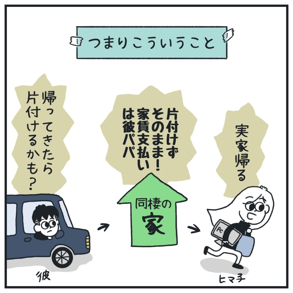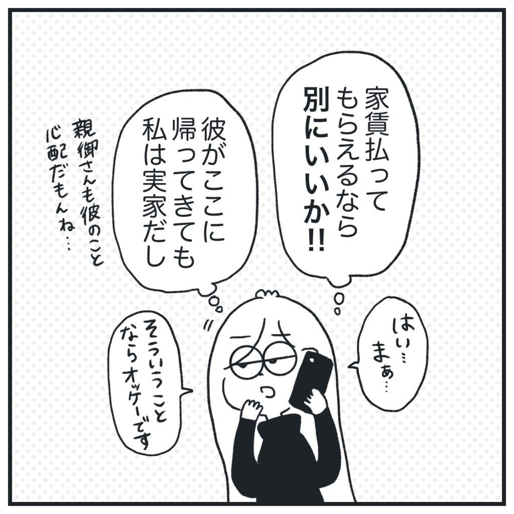 私1人で払い続ける(住み続ける)には金銭的にも現実的ではなかったもんで、なるべく早く引き払おうと焦ってたけど、彼パパが家賃持ってくれるならそのまま残すで全然問題ないっす〜!私は実家拠点になるから彼に会うことはないだろうし、荷物引き上げ時も私と彼が接触しないよう親御さんに頼めばいいか〜って。