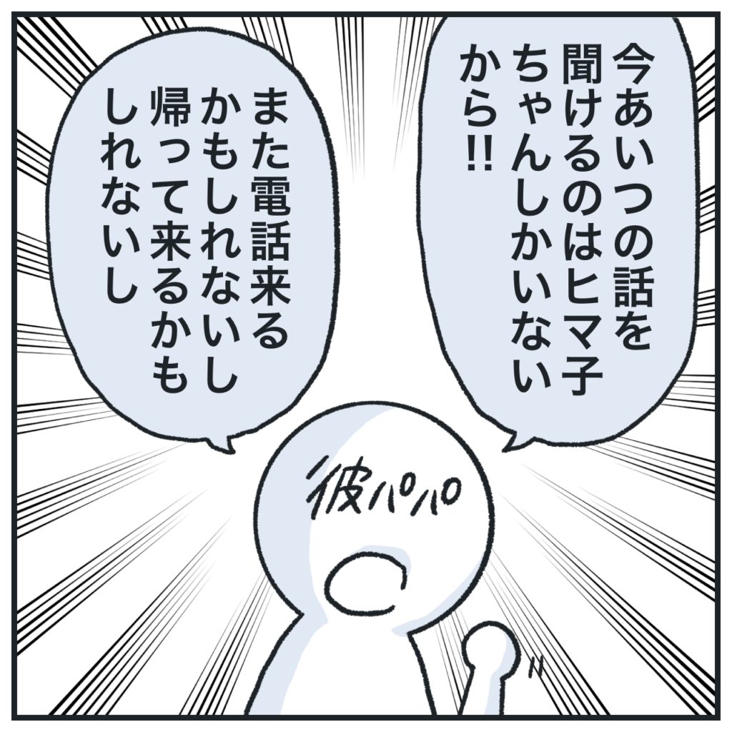 それと彼パパから「今あいつの話を聞けるのはヒマ子ちゃんしかいないから」って言われたよ。え…めっちゃ重くないっすか?彼が私にしか電話しないからって意味だよね多分…。
