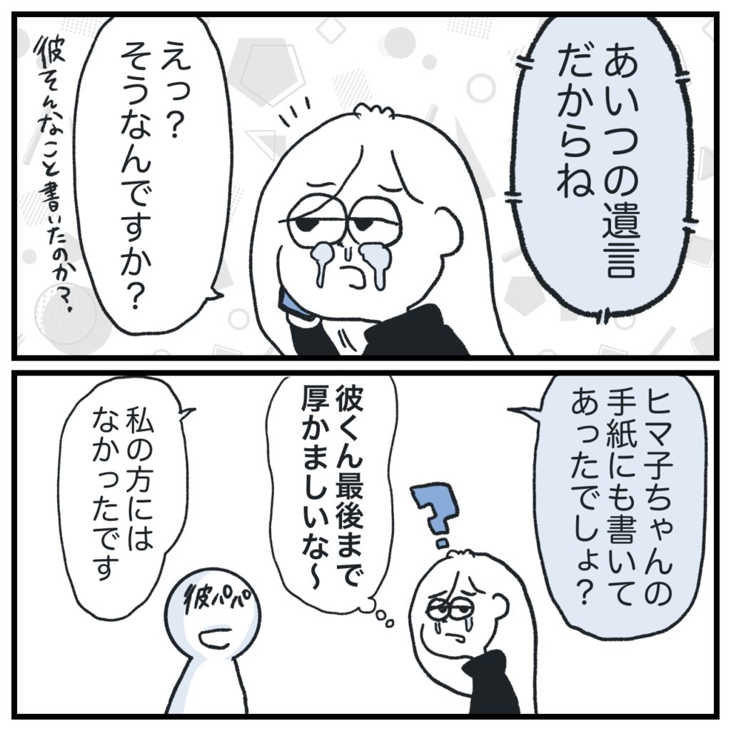 彼パパに、せめて彼の本心(無償の愛が欲しかったとか)を伝えようかとも思ったけど私は涙止まらずそれどころじゃなくて、何も言えなかった。結果として、何も言わなくてよかったと思います。