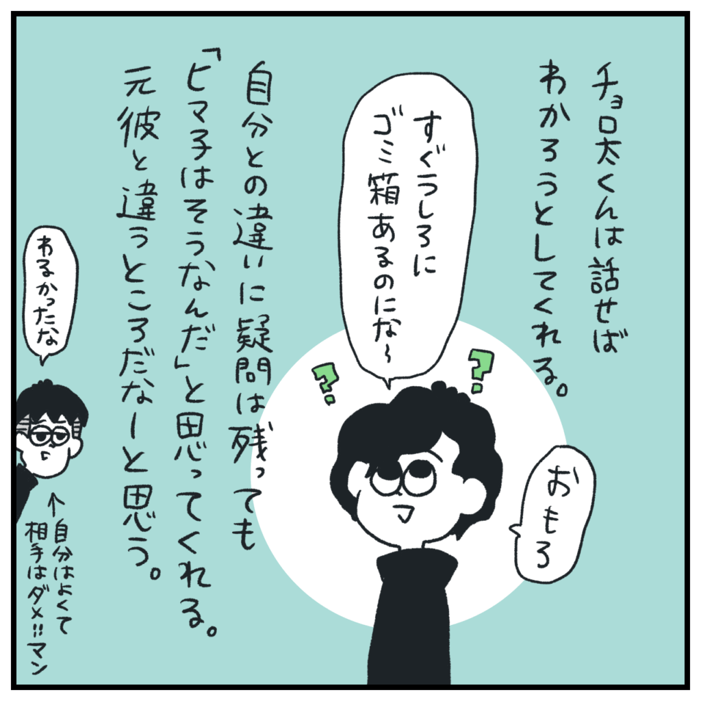 チョロ太は「なんで〜?変なの〜」とはなるけど「俺とは違うし理解できないけど、ヒマ子はそうなんだ〜」で流せる点が元彼とは違うと感じます。てか元々友達だから信頼関係が築けています。