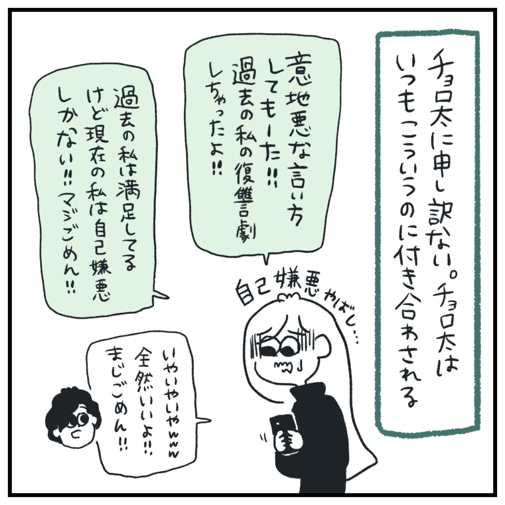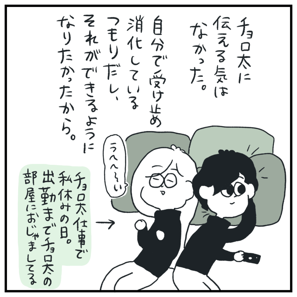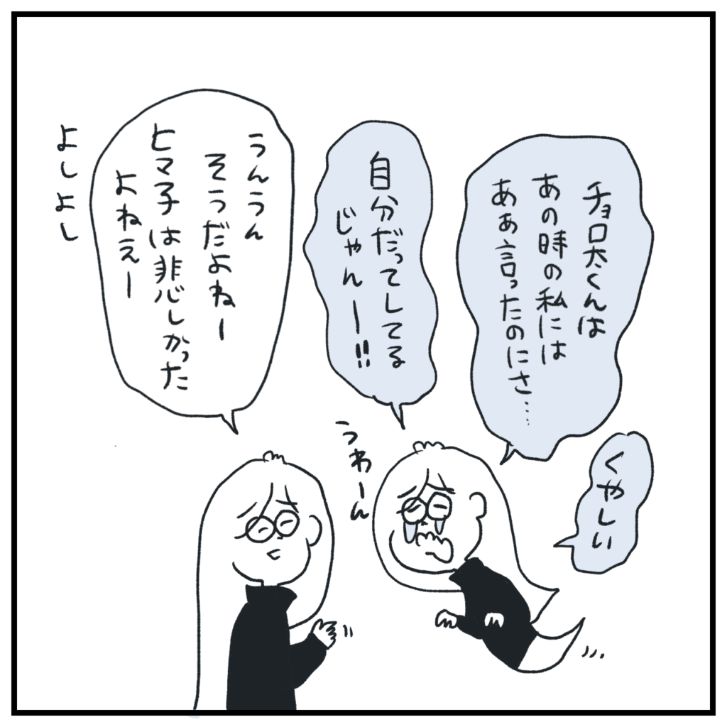 過去の私が満足した感覚はありました。だから涙も出たと思う。けど本当になんというか…現在の私はただただ虚しかった。本来は元彼との間で消化できたらよかった「理不尽な関係の構図」の消化を、チョロ太に肩代わりさせてしまった気持ちになりました。