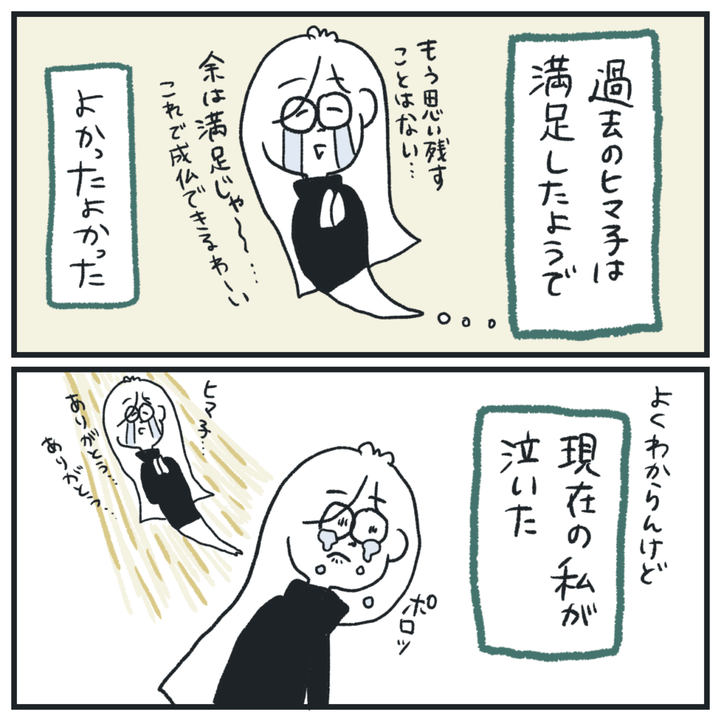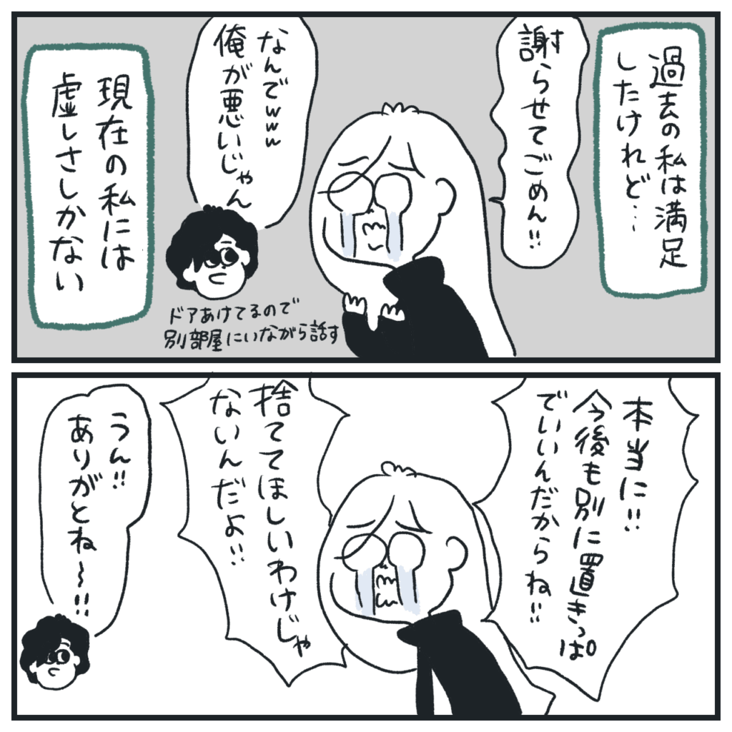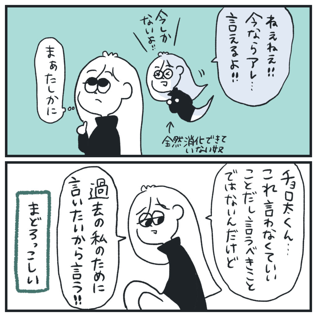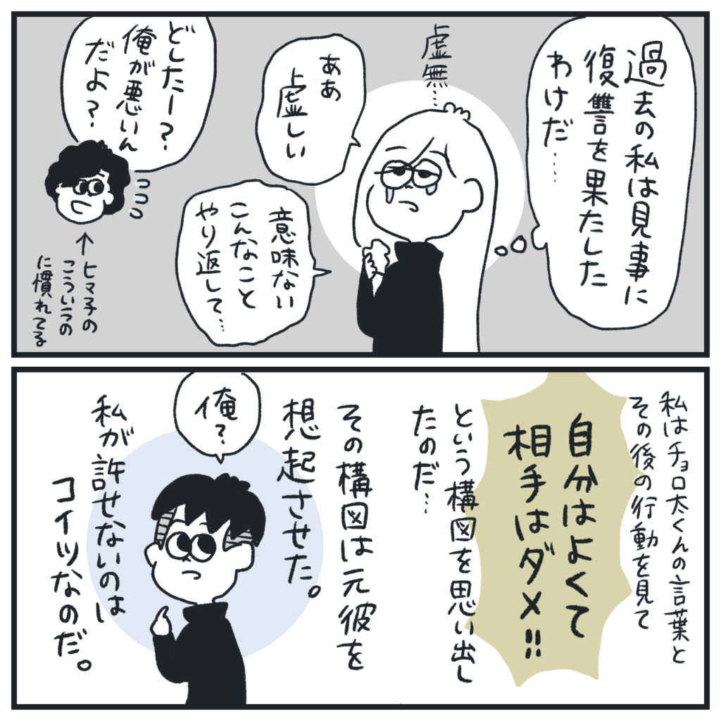 過去の私が満足した感覚はありました。だから涙も出たと思う。けど本当になんというか…現在の私はただただ虚しかった。本来は元彼との間で消化できたらよかった「理不尽な関係の構図」の消化を、チョロ太に肩代わりさせてしまった気持ちになりました。
