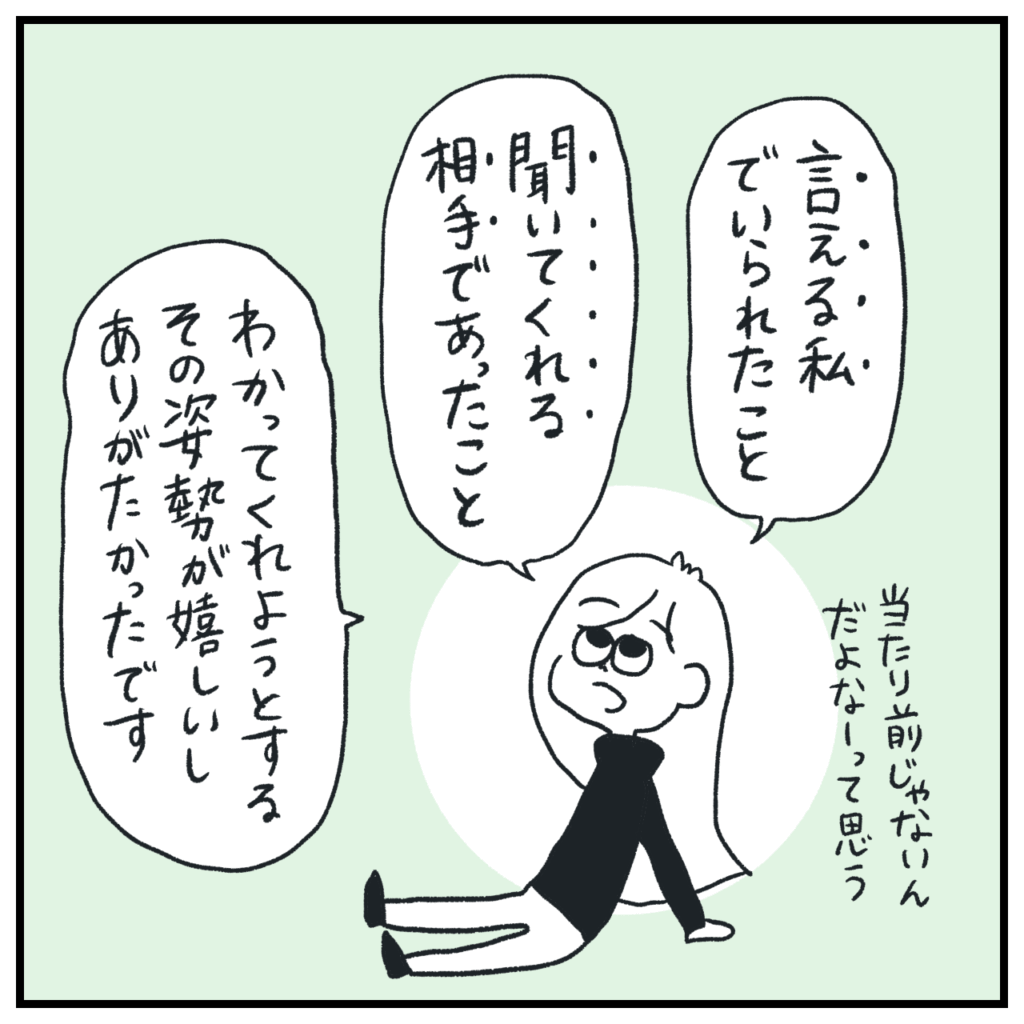 分かり合えたかどうかよりも、言える自分でいられたこと、聞いてくれる相手であってくれたこと。それがとても大切に感じました。