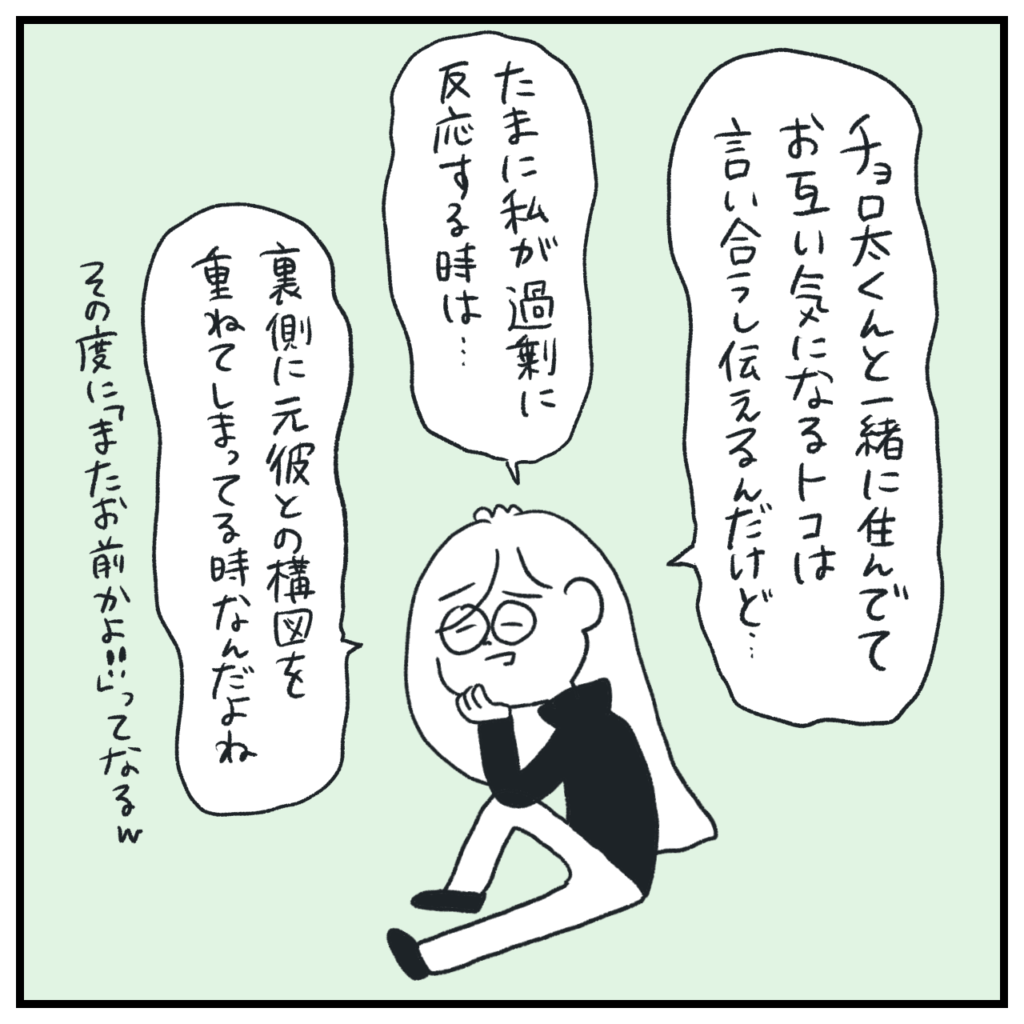 これは、チョロ太との生活の中で、チョロ太に元彼との関係を投影してしまった話だよ。チョロ太くんがどうとか…というわけじゃなくて、私の中で未整理だった感情が反応してしまったってだけ。結構頻繁に起きます。←